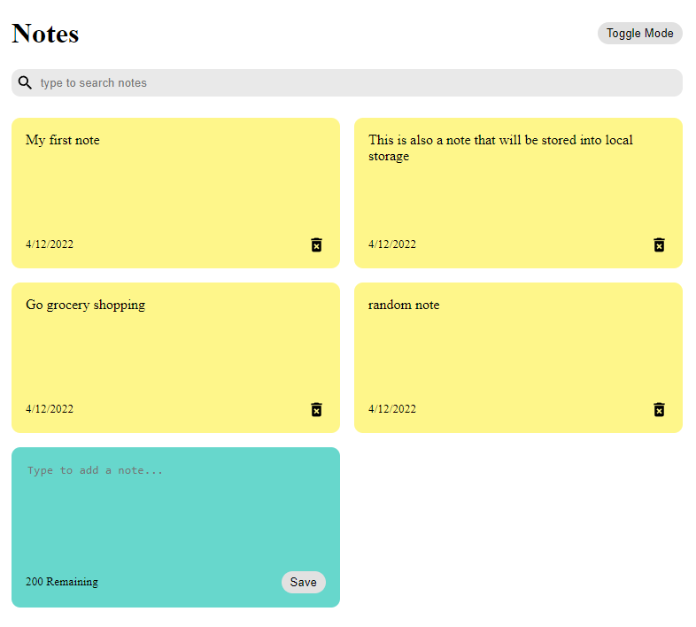 This site allows you to create notes that also persist to local storage. You're able to filter through the notes you have as well as delete notes and toggle between dark and light theme